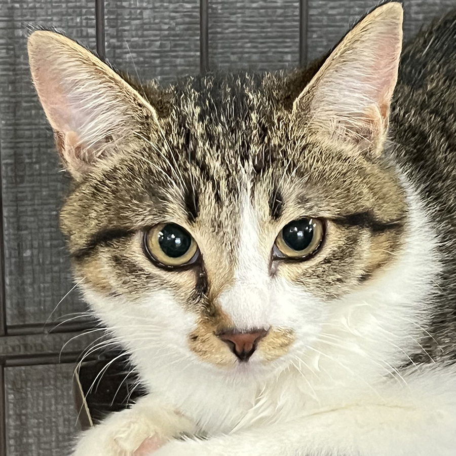 おとなしい性格のキジ白の女の子です。